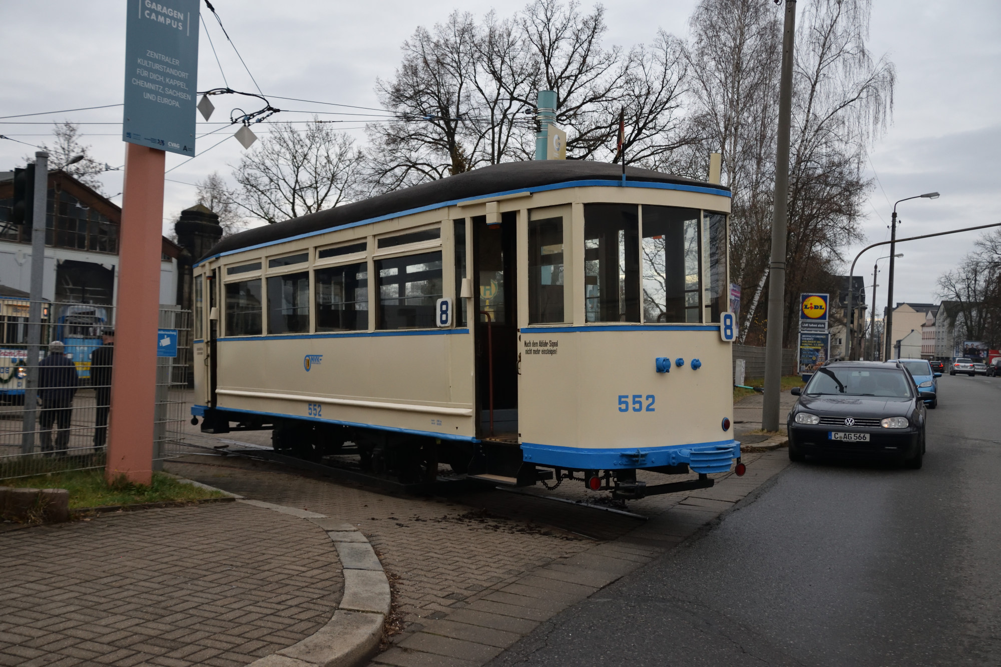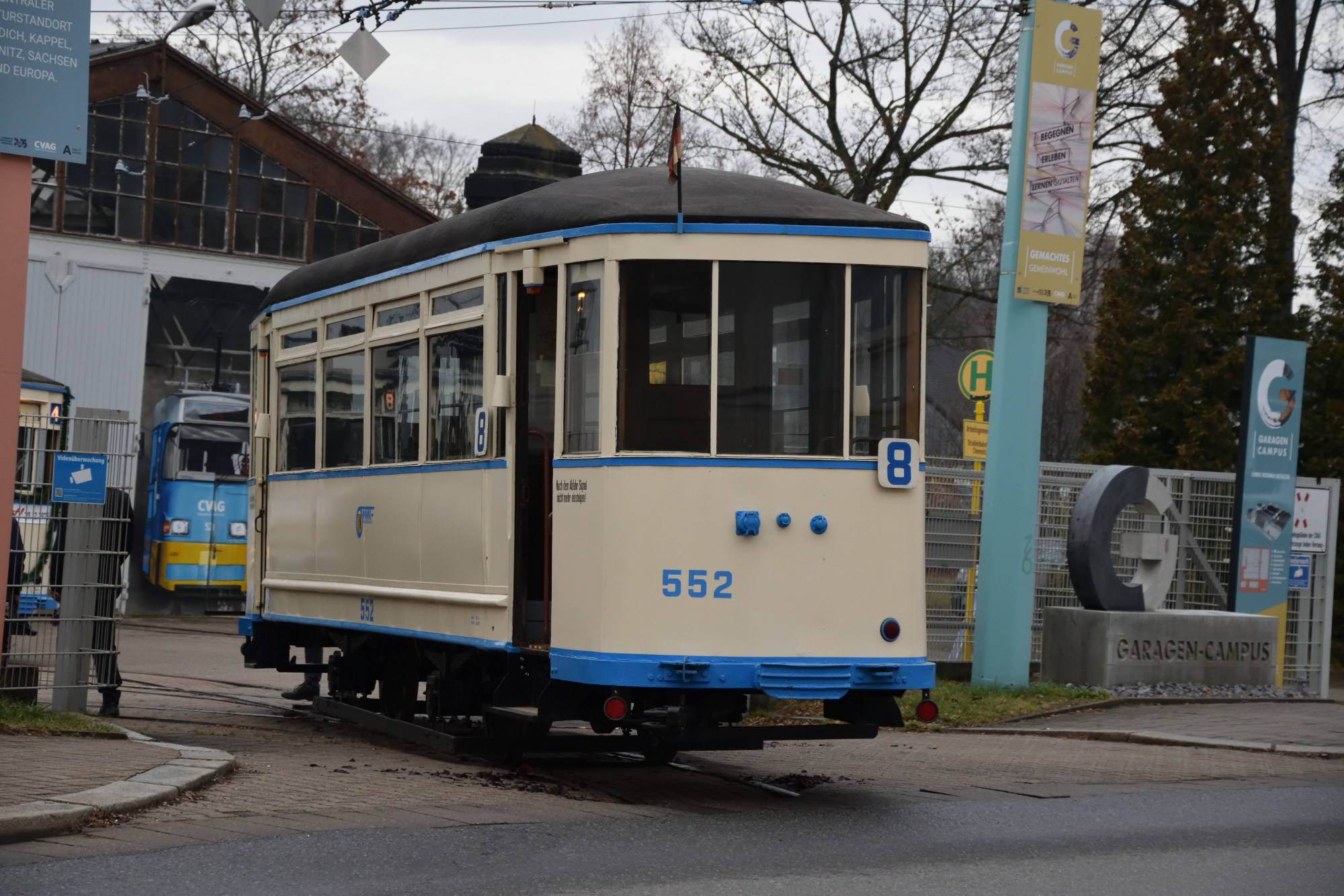 Beiwagen 552 als Linie 8 vor dem Straßenbahnmuseum
