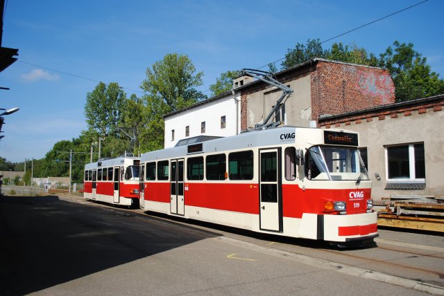 Nun ging es über die Morgenleite und die Stollberger Straße nach Gablenz bzw. in den Betriebshof Adelsberg. Dort hatten die Teilnehmer die Möglichkeit die Abstellhalle zu besichtigen. Nach der Besichtigung wurde an die Traktion noch zusätzlich der Wagen 517 an die Spitze gekuppelt.