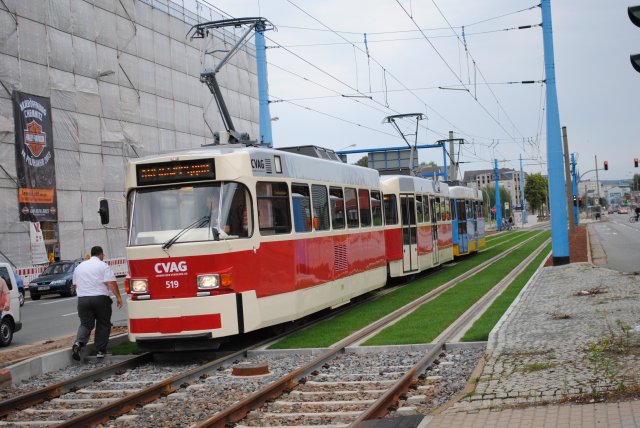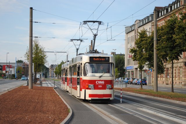 So ging es dann mit 3 Wagen weiter über den Moritzhof auf die Annaberger Straße zur Haltestelle Uhlenstraße. Dort wurde wiederum umgesetzt so das Wagen 519 vorn war und so ging es über Moritzhof und Schönau zurück zum Straßenbahnmuseum Kappel.
